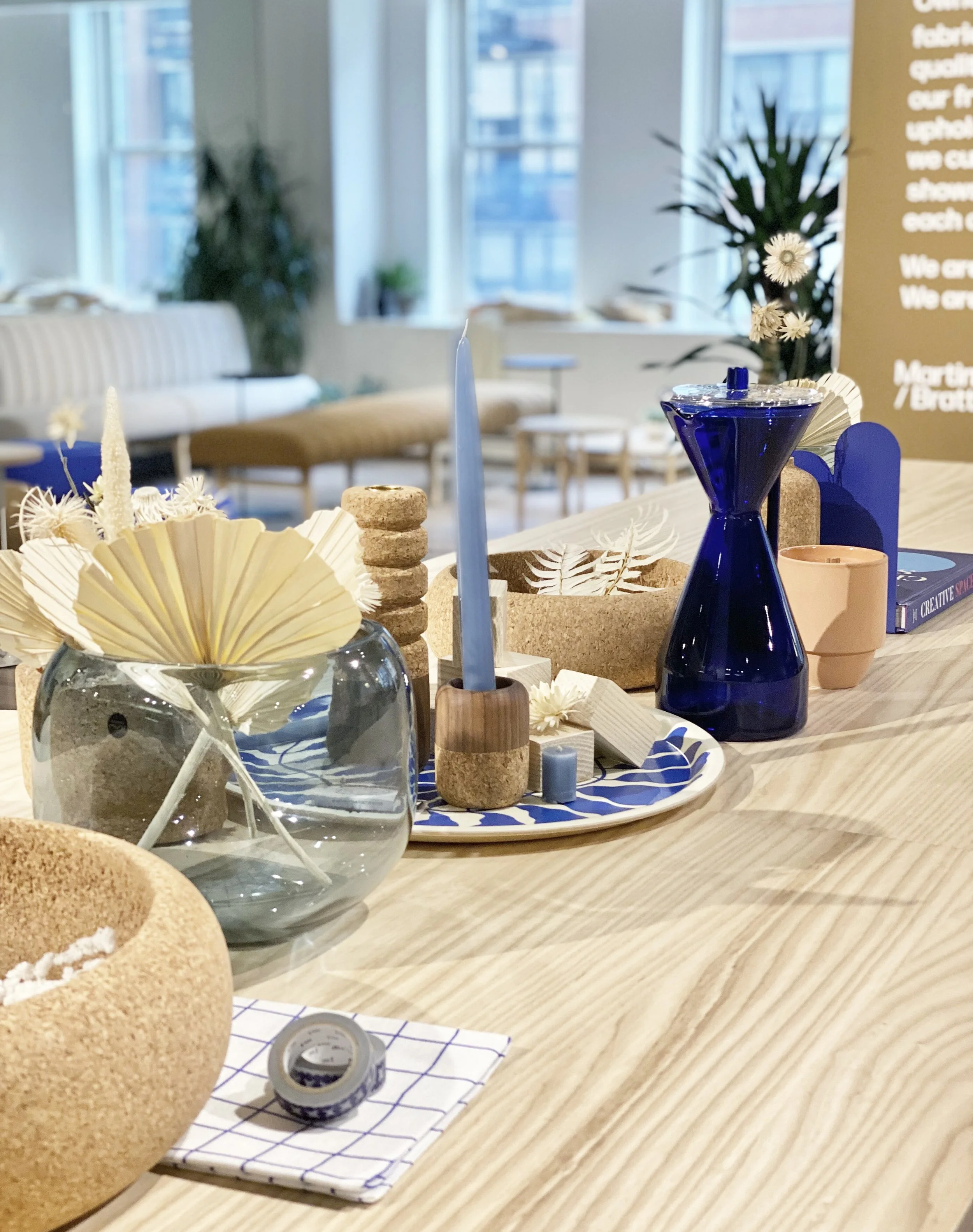 Furniture, textiles, applications, and graphics work together to tell a layered story. Textile partnerships with LUUM and Kvadrat add depth and tactility, while styling from small California brands and designers reinforces a shared sense of craft and community. Dried florals sourced from the Los Angeles Flower Market, a staple near the brand’s headquarters, ground the space in place and provenance.